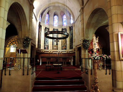 O interior conta com três naves e a Capela Maior é encimada por vitrais.