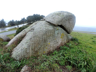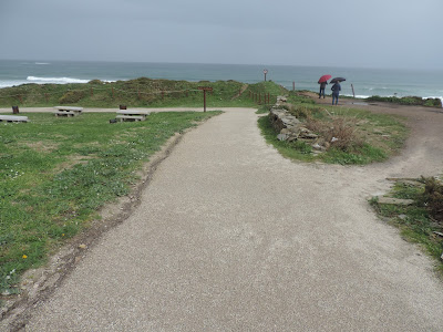 Esta praia foi declarada Monumento Natural. Quando chegámos estava a chuviscar mas isso não nos impediu de ir percorrer um passadiço de madeira com painéis informativos e admirar os rochedos saídos da água.