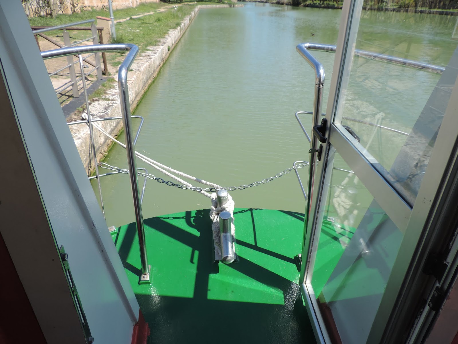 e fomos até ao local de embarque para um passeio de barco no canal. Este Canal foi construído no século XVIII para escoar os cereais produzidos na região de Castela e Leão, até aos portos marítimos do norte de Espanha. Depois de adquirir os bilhetes fomos para o barco, que tinha um sistema de navegação com duas rodas que o faziam mover ou virar, conforme as rodas giravam no mesmo sentido ou em sentido contrário.